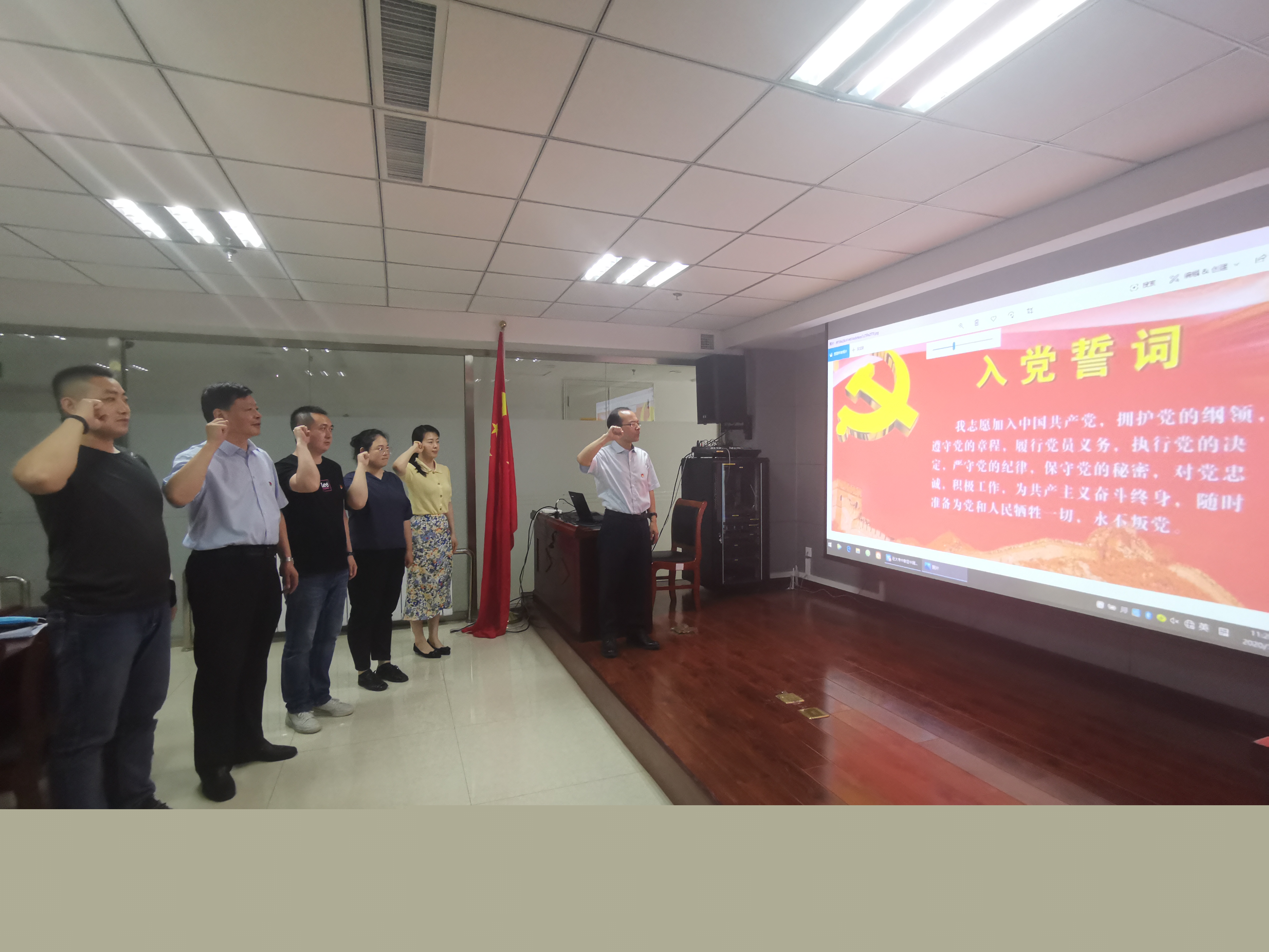 由黨支部書記焦俊良同志領(lǐng)誓,全體黨員面對(duì)鮮紅的黨旗,舉起右拳,莊嚴(yán)宣誓?!拔倚模何抑驹讣尤胫袊伯a(chǎn)黨,擁護(hù)黨的綱領(lǐng),遵守黨的章程,履行黨員義務(wù),執(zhí)行黨的決定,嚴(yán)守黨的紀(jì)律,保守黨的秘密,對(duì)黨忠誠,積極工作,為共產(chǎn)主義奮斗終身,隨時(shí)準(zhǔn)備為黨和人民犧牲一切,永不叛黨?!辩H鏘有力的誓言,讓每名黨員受到了一次深刻的黨性教育和政治靈魂洗禮。