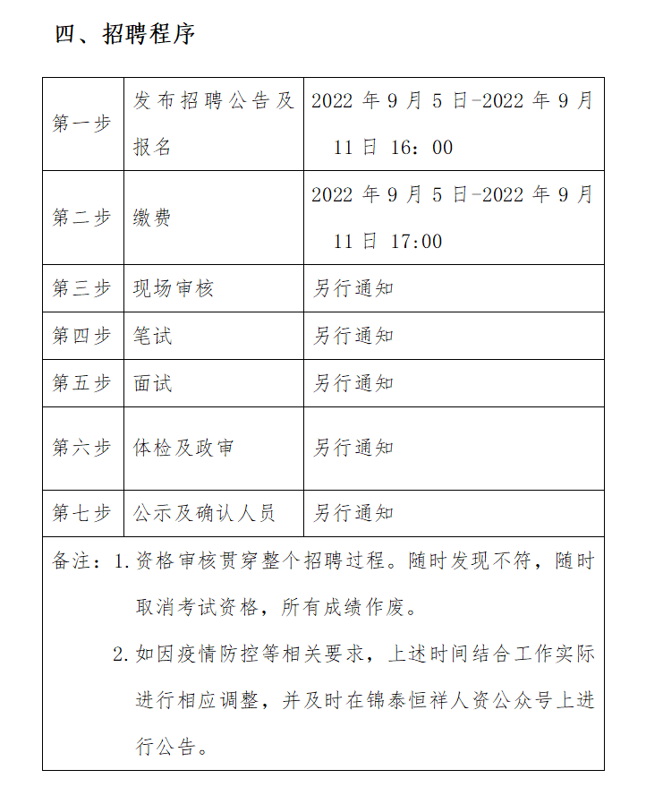 ?2022年9月5日-2022年9月11日16:00 在錦泰恒祥人資官網(wǎng)(www.jthxhr.com)、“錦泰恒祥人力資源服務(wù)有限公司”微信公眾號(hào)、“國控集團(tuán)”官方網(wǎng)站(m.jc53vm.com)及上級(jí)部門要求的相關(guān)網(wǎng)站等發(fā)布招聘公告。